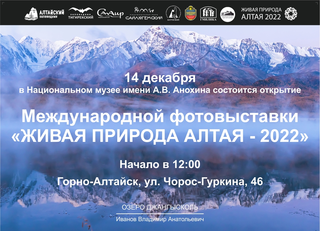 14 декабря 2022 года в Национальном музее имени А.В. Анохина (г.Горно-Алтайск) состоится открытие Международной фотовыставки "Живая природа Алтая - 2022".