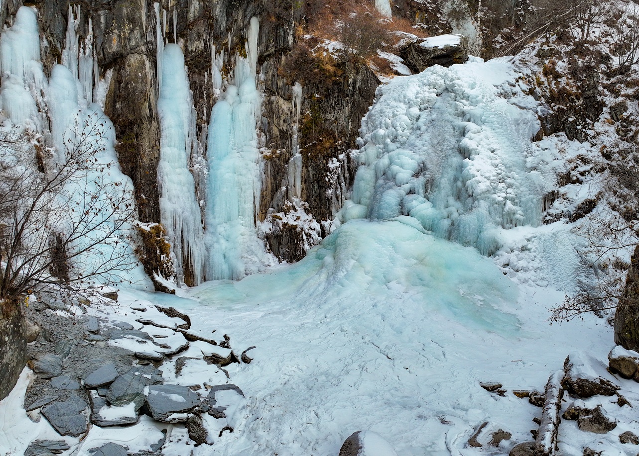 С приходом зимы жизнь здесь замирает. Единственные посетители экотропы оставили свои следы на снегу. Водопад покрылся ледяным панцирем бирюзового оттенка. С первого взгляда можно подумать, что движение здесь полностью остановилось, река замёрзла... Но если не шуметь и замереть, то можно услышать пульс водопада - через лёд доносится слабый приглушённый звук воды, а через участки тонкого льда, как через окна, виден неукротимый поток который, несмотря на мороз, продолжает свой путь к озеру даже подо льдом. Ледяные натёки свисают с отвесных скал вокруг в местах где из них просачивается вода. Зима только начинается!