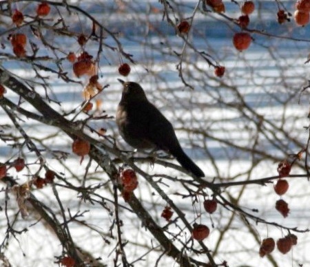 В первой декаде февраля чёрные дрозды продолжают держаться в окрестностях кордона Байгазан, вблизи яблони-дички, вместе с другими зимующими пернатыми обитателями.