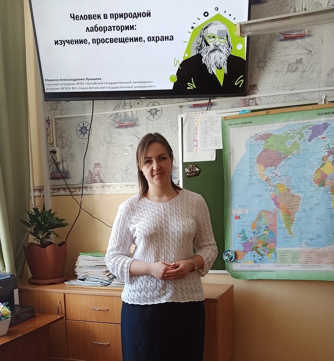 10 марта 2023 г. в Гимназии №3 г. Горно-Алтайска прошел традиционный День Науки и творчества. Марьяна Александровна Лукашева, научный сотрудник Алтайского заповедника и аспирант кафедры География и природопользование Горно-Алтайского университета, выступила с вступительным докладом на тему «Человек в природной лаборатории: изучение, просвещение, охрана».