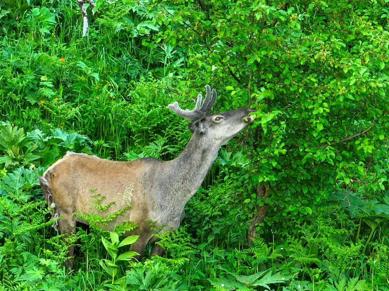 Животные стали осторожнее и из-за появившегося потомства у маралов, косуль, кабанов. Легче всего сейчас заметить медведей, они почти не скрываются, активно кормятся на сочных травах, к тому же у них сейчас период гона в разгаре, когда им все нипочем.